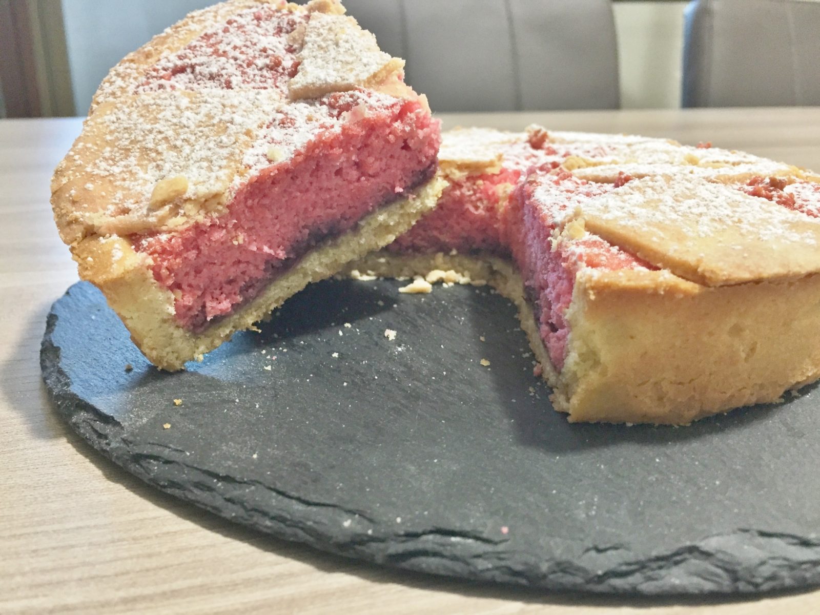 Sulla base della vostra frolla stendere un piccolo strato di marmella, io ho messo quella ai frutti rossi,sia per il contrasto del gusto acidolo che smorza la dolcezza della mandorla e sia per una scelta cromatica.