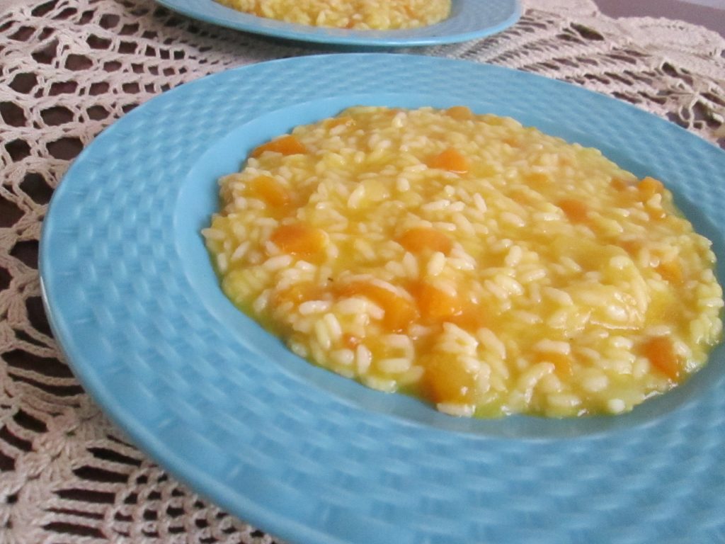 A questo punto preparate il risotto. Versate a filo il riso nella pentola dove c’è la zucca e versate un cucchiaio di olio. Mischiate continuamente per non far attaccare il riso. Alzate la fiamma e versate il vino bianco fino a farlo evaporare. Riabbassate il fuoco e cominciate a versare un pò alla volta il brodo. Mano a mano che si sta cuocendo il riso versate la crema ottenuta e mischiate. Aggiustate di sale se serve. Verso fine cottura aggiungete il parmigiano e mischiate.